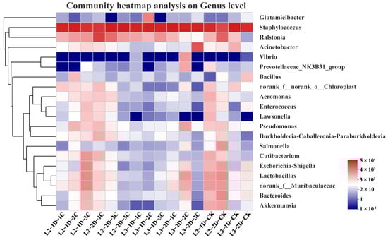 A comprehensive analysis of all samples at the genus level yielded 20 genera with high abundance. Staphylococcus was the most abundant genus in all samples, followed by Ralstonia. A heatmap analysis showed that the compositions of dominant bacteria were largely consistent between the Cry1B treatment groups and the control. Compared with the control group, the largest changes in abundance were in the genera Acinetobacter, Vibrio, and Glutamicibacter (Figure 6).