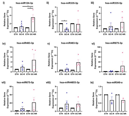 The expression of significantly altered miRNAs identified by small RNA sequencing analysis was further validated by RT-qPCR with additional, independent biological replicates of GC-R and GC-NR (n = 5 each) HTM cells. Briefly, the total RNA was extracted as described previously [] and miRNAs from each HTM cells was reverse transcribed into cDNA using miScript II RT kit as per the manufacturer’s instruction (Qiagen, Hilden, Germany). RT-qPCR was performed in a total volume of 20 µL containing 25 ng of total cDNA, 5X SYBR Green master mix and final concentration of primers. The assay was performed on an ABI-QuantStudio 5 (Applied Biosystems, Woburn, MA, USA). All miRNA levels were measured at CT threshold levels and normalized with the average CT values of reference target RNU6. Values were expressed as fold increase over the corresponding values for control by the 2−ΔΔCT method. All PCR reactions were performed in triplicates.