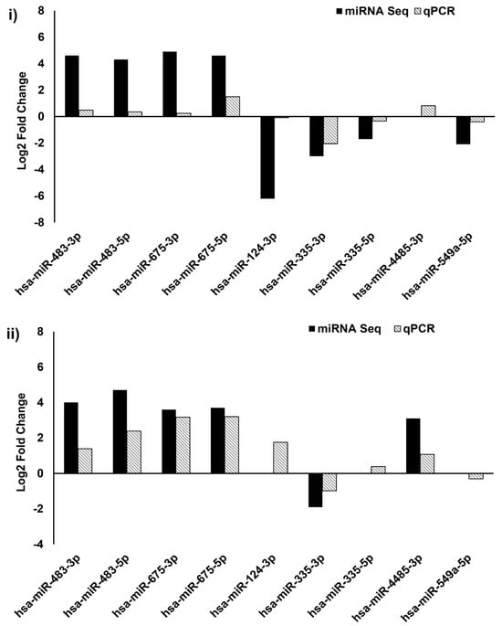 Validation of miRNA sequencing by qPCR. Comparison of selected genes expression profile from Group #1 (i) and Group #2 (ii) miRNA sequence by qPCR; 2ΔΔCt method was used for calculation of miRNA expression changes and U6 was used as an internal control.