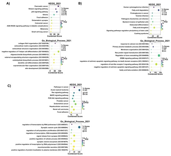 Top 10 predicted KEGG pathways and GO biological processes of the ‘Target MRNA List 1’ of Group #3 (A), #4 (GC-R) (B), and #5 (GC-NR) (C). Dot colors: Log (1/p-value). Dot sizes: % genes in set. The combined score is defined based on the percentages of genes in set and Log (1/p-value) by []. p-value < 0.05 was considered to be statistically significant.