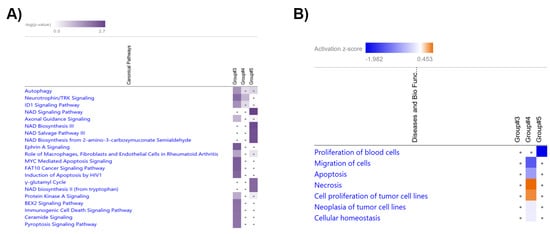 The comparative analysis of the pathways of the ‘Target MRNA List 2’ in Group #3, #4 and #5 was performed by IPA software (Supplementary File S2 List 2D). The top 20 significant pathways in Group #3, #4 and #5 ranked by −log(p-value) are shown in Figure 7A. The results show that neurotrophin/TRK signaling was significant in Group #3 (−log(p-value) = 2.18) and #4 (GC-R) (−log(p-value) = 1.34). NAD signaling pathway (−log(p-value) = 2.67), NAD biosynthesis III (−log(p-value) = 2.55), NAD salvage pathway III (−log(p-value) = 2.49), NAD biosynthesis from 2-amino-3-carboxymuconate semialdehyde (−log(p-value) = 2.49), NAD biosynthesis II (from tryptophan) (−log(p-value) = 2.22), and γ-glutamyl cycle (−log(p-value) = 2.22) pathways were found to be significant only in Group #5 (GC-NR) (Supplementary File S2 List S2D).