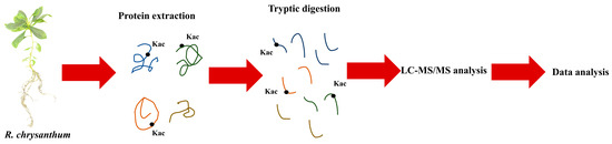 Lysine acetylation has been found to be an abundant and important PTM that affects a variety of important biological processes in organisms [19,20,21]. Indeed, PTMs play a vital role in several signaling pathways in plants, and they mainly harmonize protein functions [22] by altering the activities, subcellular localization, and stability of proteins [23]. Lysine acetylation (Kac) has been extensively studied and found to exhibit a prominent role during plant resistance to abiotic stress [24,25,26,27,28]. In the last few years, developments in proteomics have provided a foundation for understanding the lysine acetylation proteome and new directions for investigating the extent and regulatory mechanisms of the non-histone protein Kac [29]. However, although the Kac contents of Arabidopsis thaliana [30,31], poplar (Populus tremula × Populus alba) [32], rice (Oryza sativa) [33,34], pea (Pisum sativum L.) [35], and wheat (Triticum Aestivum) have been intensively investigated [36], there have been very few studies on the Kac content of R. chrysanthum.