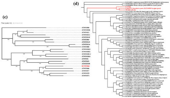 To explore the function of RcMYB44, we compared it with the model organism Arabidopsis MYB and constructed a homology evolution tree. We divided the evolutionary tree into six groups, each labeled with a different color, with the pink group containing RcMYB44 (Figure 2b). We analyzed this group exclusively and found that RcMYB44 shares a common ancestor with ATMYB44, ATMYB77, ATMYB73, and ATMYB70, and RcMYB44 is more homologous to ATMYB44, which is presumed to have the same function (Figure 2c). According to studies reported in the literature, during adversity stress, ATMYB44 regulates the response of Arabidopsis to adversity stress through the salicylic acid, jasmonic acid, growth hormone, and abscisic acid signaling pathways [37,38,39]. To elucidate the mechanism of action of RcMYB44 against UV-B stress we further analyzed proteins from other species homologous to RcMYB44. A blast homology comparison using NCBI was used to find proteins of other species with a similar homology, allowing us to further construct the evolutionary tree, which showed that only two proteins from two species might have the same function as RcMYB44, namely, Medicago truncatula and Syzygium grande, with the protein from Medicago truncatula being a disease-resistant protein and that from Syzygium grande being a hypothetical protein with an unknown function (Figure 2d).
