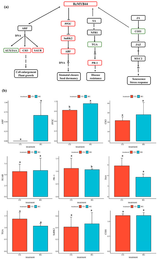 Protein expression (a,b) showing differential expression of RcMYB44 involved in hormone signaling pathway proteins in response to UV-B treatment for 48 h in R. chrysanthum. (a) Analysis of proteins in hormone pathways involved in RcMYB44. Green indicates down-regulation of protein expression, red indicates up-regulation of protein expression. (b) Protein expression showing differential expression of proteins in hormone pathways. Small letters a and b indicate significant differences (p < 0.05).
