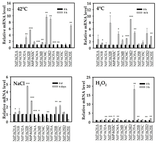 3.4. Expression Changes of Tobacco PAOs in Response to Abiotic Stress Treatments