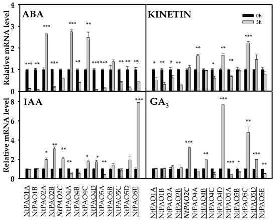 3.5. Expression Responses of Tobacco PAO-Coding Genes in Response to Phytohormones