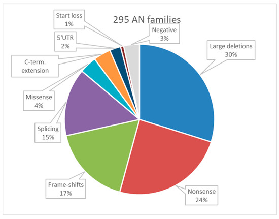 PAX6 small variants were identified in 197 out of the 295 probands. Among these small variants, single nucleotide substitutions were responsible for aniridia in 135 probands and small indels (insertions or deletions) were found to be the cause of aniridia in 62 probands. Large chromosome deletions or other significant rearrangements in the PAX6 region were identified as the cause of aniridia in 88 probands. Within the group of chromosome deletions only PAX6 DDR deletions, not encompassing its coding sequence, were defined in 23 probands. The deletion removes the very important enhancers region, which also led to the aniridia phenotype [25]. Within the total sample, chromosome rearrangements that encompassed the “WAGR-region” were detected in 28 probands. These findings provide valuable insights into the genetic mechanisms underlying aniridia in this diverse and comprehensive sample. In 10 AN families, no genetic cause has been defined.