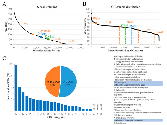 Figure 1. Overview of the dataset. Plasmid size (A) and GC content (B) distribution. Mean and median values are indicated by blue and green dots, respectively. The cutoffs for categorical terms are indicated with orange dots. (C) Distribution of plasmid-borne proteins among COGs (shown on the right). The pie chart shows the proportion of proteins in COGs. The bar chart shows the fraction of proteins assigned to a given COG; fractions of the Z, A, and B categories are indicated by numbers. The three most prevalent COG categories are highlighted in the table.
