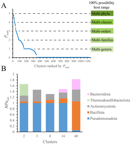 Figure 3. Defining the plasmid distribution possibility. (A) The sum of distribution possibility (Psum). Meanings of the Psum for distribution levels are indicated. (B) Phyla distribution for clusters with Psum > 4.7. Only clusters with more than 100 plasmids were considered. NPntax: for a given taxon, the plasmid number is normalized by the average plasmid number per cluster.