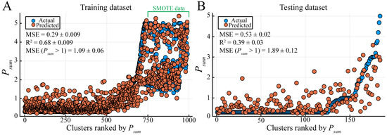 Figure 4. Performance of the final model stack. The dataset was split 100 times randomly into training (A) and testing (B) dataset pairs. The model stack was trained on the training dataset, and then tested on paired unseen testing datasets. MSE, mean squared error. R2, coefficient of determination. MSE (Psum > 1), MSE for those clusters with Psum > 1. Values are reported as mean ± SD (n = 100). The data points on the very right of the training dataset were synthesized by SMOTE.