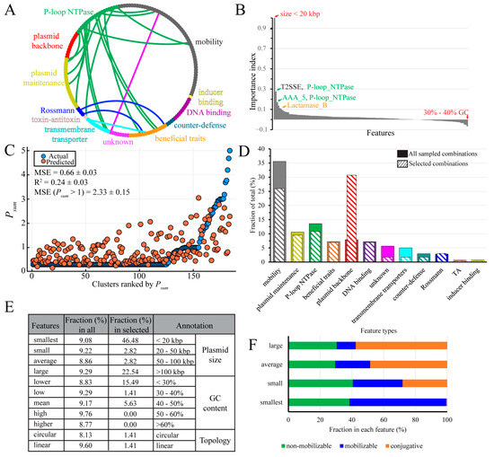 Here, we deployed machine learning to identity important features in this complex dataset. After grouping features into broader structural and functional categories, we were left with nearly eight thousand features that did not support good model performance. After the removal of less informative and noise-generating features, a final set of 140 features was used for analysis. Consistent with earlier findings [33], we found that most plasmids were restricted to species level (Figure 3A). Only ~1% of clusters had more than a 70% possibility of multi-phyla distribution (Figure 3A), and most plasmids in these clusters came from one phylum, a result due in part to the strong sampling bias toward Pseudomonadota and Bacillota (Figure 3B and Figure S2). An optimized model stack (Table 1) identified the “smallest” (under 20 kbp) size as the most important feature, either alone (Figure 5B,C) or as part of randomly sampled seven-feature combinations (Figure 5E).