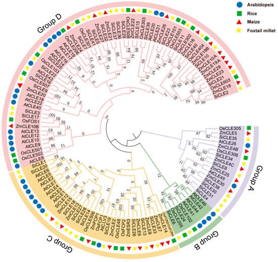 To evaluate the evolutionary relationship of the SiCLE peptides in foxtail millet, Arabidopsis, rice, and maize, a phylogenetic tree using the neighbor-joining (NJ) method was constructed based on the full-length sequences of 41 SiCLE peptides with other CLE peptides identified in the three species (Table S2). All the CLE members clustered into four groups, named Groups A-D, in the phylogenetic analysis (Figure 1). Group C and Group D contain a relatively larger number of CLE genes, with eleven and twenty-one SiCLE genes, respectively. Group C CLE peptides include AtCLV3, OsFCP1, OsFCP2, OsFON2/OsFON4, ZmFCP1, and ZmCLE7 [,,,,], which all participate in the stem cell differentiation and maintenance in SAM. The eleven SiCLE genes in Group C may play a conserved function in the stem cell differentiation and maintenance in the SAM of foxtail millet. Almost all the AtCLE peptides in Group D are called root-active CLE peptides, and they all led to short-root, suppressed protophloem differentiation and consumption of root apical meristem (RAM) phenotypes by applications of individual peptides in vitro [,]. The twenty-one SiCLE genes may be involved in the stem cell homeostasis in the root of foxtail millet. Group B has the least number of CLE genes and contains only two SiCLE genes, namely SiCLE6 and SiCLE24. AtCLE41 and AtCLE44 belong to Group B. It has been identified that AtCLE41p and AtCLE44p have the ability to inhibit the differentiation of mesophyll cells into xylem cells in an in vitro xylogenic culture system []. SiCLE6 and SiCLE24 may have similar functions in vascular bundle development in foxtail millet. The remaining seven SiCLE genes belong to Group A, and the mechanism of CLE genes in this group has not yet been resolved clearly. The results indicate a high degree of conservation and similar functions within each group, suggesting that SiCLE peptides in Groups C and D may play similarly important roles in maintaining homeostasis of the SAM and RAM, respectively. Additionally, Group B may be involved in vascular bundle development.
