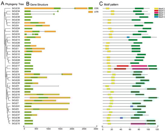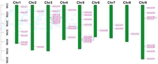 Based on genome annotation, we conducted a comprehensive analysis of the gene structure of SiCLE genes (Figure 2). The majority of SiCLE genes exhibited either intron-less structures or had only a few introns. Out of the total 41 SiCLE genes, 34 were single-exon genes, 6 were two-exon genes, and 1 was a three-exon gene. Moreover, more than half (24/41) of the SiCLE genes lacked untranslated regions (UTRs), while the remaining 17 SiCLE genes possessed either 3′UTRs or both 5′ and 3′UTRs. The lack of introns and UTRs in SiCLE genes may be attributed to genomic simplification, which minimizes non-coding regions to enhance genome efficiency and replication speed []. Notably, SiCLE genes within the same phylogenetic cluster demonstrated similar features despite displaying diverse gene structures.