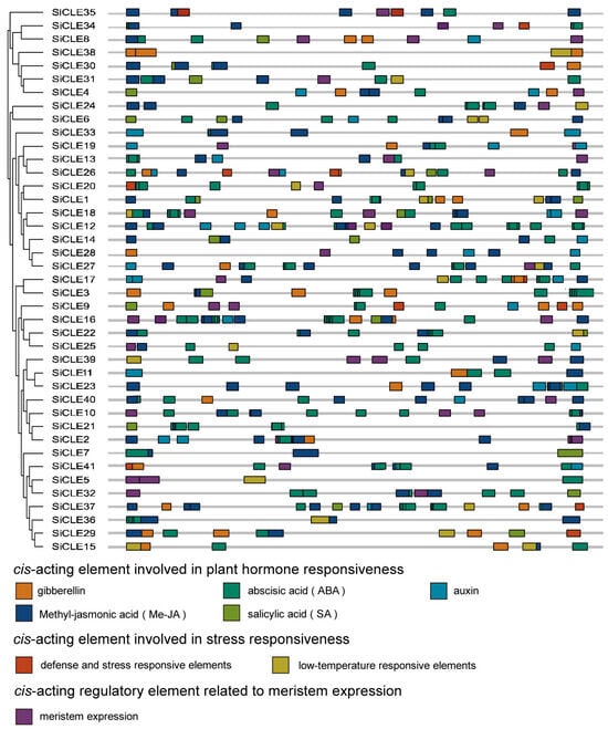 Cis-elements play a crucial role as molecular switches in the transcriptional regulation of genes during plant growth and responses to abiotic stress [,,]. To investigate the potential regulatory mechanisms of SiCLE genes in the growth and development of foxtail millet, the 2-kb promoter sequences upstream from the translation start codon of 41 SiCLEs were retrieved from foxtail millet genome sequences and analyzed using the PlantCARE website. We identified eight types of cis-acting elements grouped into three major categories (Figure 3, Table S3). These elements included plant hormone-responsive elements, including auxin, gibberellin, SA, ABA, and Methyl-jasmonic acid (Me-JA); stress-responsive elements contain low temperature and defense and stress; and elements involved in meristem expression regulation. Notably, multiple types of cis-acting elements were unevenly distributed across each SiCLE gene. In accordance with previous findings [], it was observed that each SiCLE gene in foxtail millet contained at least one phytohormone-related cis-acting element. Most (34/41) SiCLE genes possessed more than three types of phytohormone-responsive elements on their promoters, with the exception of SiCLE5, SiCLE10, SiCLE20, SiCLE24, SiCLE36, SiCLE38, and SiCLE39. Notably, six SiCLE genes (SiCLE4, SiCLE8, SiCLE9, SiCLE16, SiCLE18, and SiCLE26) exhibited all five types of plant hormone-responsive elements, while SiCLE26 had all eight types of elements. Among the various types of cis-acting elements, ABA responsiveness elements were found to be the most abundant in the promoters of SiCLE genes in foxtail millet, with an average of 3.66 elements per gene. Notably, SiCLE16 exhibited the highest number of ABA responsiveness elements, with a total of 11 ABA elements present in its promoter region. Only SiCLE28 and SiCLE38 contained no elements involved in ABA responsiveness. On the other hand, the number of cis-acting elements involved in defense and stress responsiveness was the lowest, and only nine SiCLE genes (SiCLE9, SiCLE17, SiCLE20, SiCLE26, SiCLE29, SiCLE30, SiCLE34, SiCLE37, and SiCLE41) had no more than two elements involved in defense and stress responsiveness. These findings suggest that SiCLE genes are not only involved in tissue development processes but also exhibit responsiveness to various plant hormones.