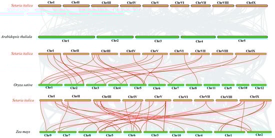 Synteny analyses of the SiCLE genes between S. italica and three representative plant species. Gray lines on the background indicate the collinear blocks within S. italica and other plant genomes; red lines highlight the syntenic S. italica SiCLE gene pairs.