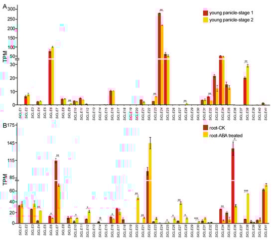 Expression patterns of SiCLE genes in young panicles and roots of foxtail millet. (A) Expression patterns of SiCLE genes in young panicles at different formation stages: branch meristems specified (stage 1, approximately 1.0–1.5 mm) and later stage with clearly formed branch meristems (stage 2, approximately 2.5–3.0 mm). (B) Expression patterns of SiCLE genes in the roots of 9-day-old seedlings with ABA treatment (2 μM) and without ABA as the control (CK). The bars represent the variation between replicates in the transcriptome sequencing of young panicle samples (A) and root samples (B). Statistically significant differences between the two stages of the panicle (A) and the root with and without ABA treated (B) were determined according to t-test (* p < 0.05, ** p < 0.01, *** p < 0.001).