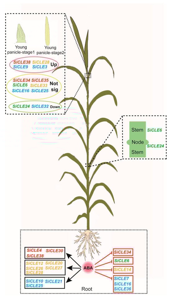CLE peptides play a critical role in regulating stem cell maintenance in plants []. Stem cells located within the SAM, RAM, and procambium are established during embryogenesis and continue to generate new tissues and organs during post-embryonic growth and development. The SAM is responsible for the formation of inflorescence meristems, which give rise to flowers and panicles, while the RAM is involved in root growth and development. Transcriptome sequencing was conducted to investigate the expression levels of SiCLE genes in young panicles at the formation stage and roots of seedlings (Figure 7). Our analysis revealed that the expression levels of most SiCLE genes were relatively low in the young panicle (Figure 7A). Notably, SiCLE6, SiCLE24, SiCLE25, and SiCLE34 exhibited higher expression levels compared to SiCLE16, SiCLE33, SiCLE35, and SiCLE38. Additionally, the remaining SiCLE genes showed lower expression levels compared to these eight genes. Based on their expression patterns, these eight genes are included in four groups of the phylogenetic tree: Group A (SiCLE34, SiCLE35, and SiCLE38), Group B (SiCLE6 and SiCLE24), Group C (SiCLE33), and Group D (SiCLE16 and SiCLE25). In particular, the expression of SiCLE24 and SiCLE32 was significantly reduced in the young panicle at stage 2 compared to stage 1. Conversely, SiCLE9, SiCLE23, SiCLE28, and SiCLE38 exhibited higher expression in the later stage. Compared to the young panicle, a greater number of SiCLE genes exhibited higher expression levels in roots (Figure 7B). Notably, SiCLE7, SiCLE22, and SiCLE36 showed the highest expression in roots, followed by SiCLE41, SiCLE1, SiCLE17, SiCLE3, SiCLE34, and SiCLE35, while the remaining genes displayed lower expression levels. These nine SiCLE genes are classified into four groups within the phylogenetic tree: Group A (SiCLE34 and SiCLE35), Group C (SiCLE1), and Group D (SiCLE3, SiCLE7, SiCLE16, SiCLE17, SiCLE22, SiCLE36, and SiCLE41). Moreover, ABA plays a crucial role in regulating root development and growth. It influences root meristem activity, elongation, and branching, thereby modulating overall root architecture []. In order to detect the response of SiCLE genes after ABA treatment, transcriptome sequencing analysis was performed on the roots of foxtail millet seedlings treated with ABA. The expression of eleven SiCLE genes (SiCLE4, SiCLE10, SiCLE12, SiCLE20, SiCLE21, SiCLE25, SiCLE26, SiCLE27, SiCLE28, SiCLE30, and SiCLE38) was significantly up-regulated, while six SiCLE genes (SiCLE6, SiCLE7, SiCLE14, SiCLE16, SiCLE34, and SiCLE36) were significantly down-regulated. The results presented above indicate that the expression of SiCLE genes exhibits temporal and spatial specificity, and many members of this gene family are specifically involved in the development of young panicles and roots.