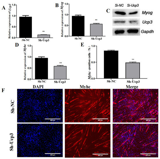 Ucp3 silencing slowed myogenesis of C2C12 cells. (A) Expression level of Ucp3 was determined using qRT–PCR following shRNA knockdown. (B) mRNA levels of Myog knockdown, as detected using qRT–PCR. (C) Western blot was used to test Ucp3 and myogenic factor Myog. (D) The level of Myhc mRNA after knockdown of Ucp3. (E,F) Myotube formation was detected using immunofluorescence and quantified positive cell statistics. **: p < 0.01.