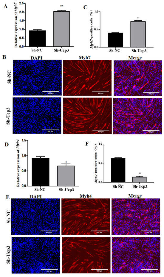 To further determine the regulatory effect of Ucp3 on myofiber types during myogenic differentiation, the overexpression vector of Ucp3 was transfected into C2C12 cells using lentivirus. The expression of Myh7 decreased (Figure 4A) and the number of Myh7-positive cells reduced (Figure 4B,C). Meanwhile, the expression of Myh4 was upregulated (Figure 4D) and the number of Myh4-positive cells increased (Figure 4E,F). In contrast, the expression of Myh7 was upregulated (Figure 5A) and the number of Myh7-positive cells increased (Figure 5B,C) in C2C12 cells transfected with the Ucp3 shRNA vector. The result of Myh4 was the opposite of Myh7 (Figure 5D–F).