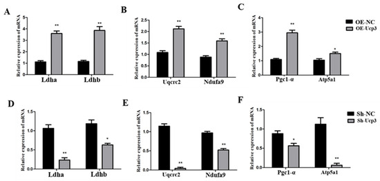 Subsequently, the effects of Ucp3 on energy metabolism were detected. With the Ucp3 overexpression in C2C12 cells, the expression of the glycolysis-related genes (Ldha and Ldhb), oxidative-phosphorylation-related genes (Uqcrc2 and Ndufa9) and mitochondrial-activity-related genes (Pgc1-α and Atp5a1) increased significantly (Figure 6A–C). In contrast, all the above gene expressions decreased due to Ucp3 knockdown (Figure 6D–F).