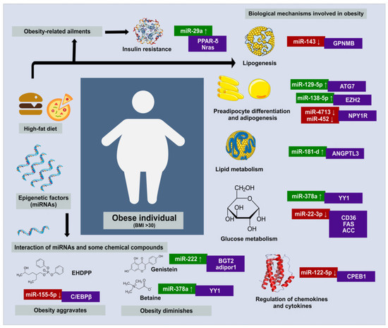 Multiple miRNAs are found to be associated with obesity and obesity-associated ailments, such as diabetes or NAFLD. In obesity, preadipocyte differentiation and proliferation, lipid metabolism, and adipogenesis are the processes that are affected the most by miRNAs, while insulin resistance seems to be a biological mechanism that is commonly regulated by miRNAs in obese individuals.