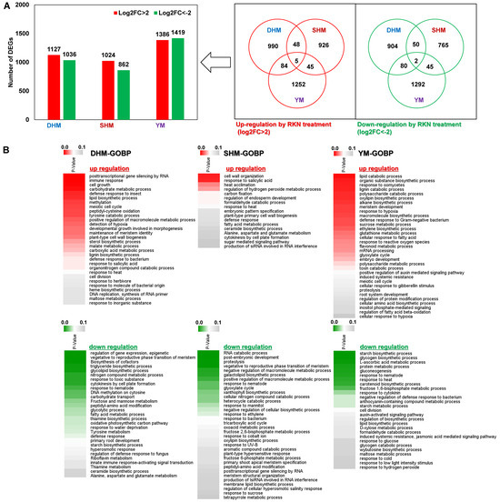 Identification of DEGs in response to RKN infection in three RKN-susceptible sweet potato cultivars. (A) Numbers of DEGs up- or down-regulated by Log2FC > 2 (fold change > 4) in response to RKN infection. (B) GO biological process category heatmaps of DEGs in control (uninfected) and treated (RKN-infected) conditions for each cultivar. Heatmaps show Benjamini–Hochberg-adjusted (p < 0.05) for DEGs enriched for specific GO terms in the biological process (GOBP) category. DHM, Dahomi; SHM, Shinhwangmi; YM, Yulmi.