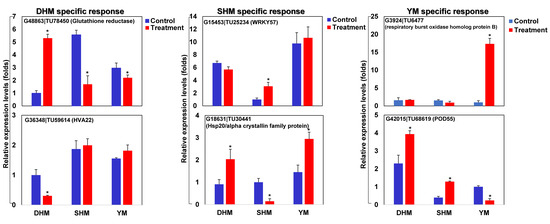 Selected cultivar-specific genes were assessed using qRT-PCR analysis (Figure 6). G48863|TU78450 (glutathione reductase) showed a specific increase in response to RKN infection only in DHM, with decreased expression seen in SHM and YM. The expression of G36348|TU59614 (HVA22) was reduced only in DHM, with no change of responses in SHM or YM. G15453|TU25234 (WRKY57) increased specifically in SHM, with no response changes in DHM or YM. G18631|TU30441 (Hsp20/α crystallin family protein) expression decreased in SHM and increased in DHM and YM. G3924|TU6477 (respiratory burst oxidase homolog protein B) showed an increased expression in YM, with no change in response in DHM and SHM. G42015|TU68619 (POD55) exhibited decreased expression only in YM, with increased expression in DHM and SHM.