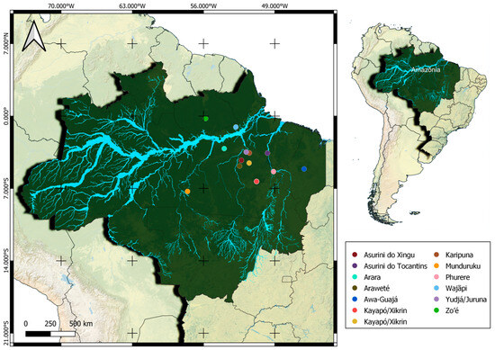 Location of Amazonian tribes present in this study. Image made on QGIS 3.28.0 software.