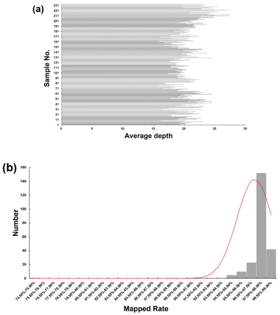 GBS sequencing of the DH population. (a) Sequencing depths of 232 samples. The x-axes indicate sequencing depth and the y-axes indicate individual samples. (b) Frequency distribution of the percentage of raw reads of each sample mapped to the reference genome.