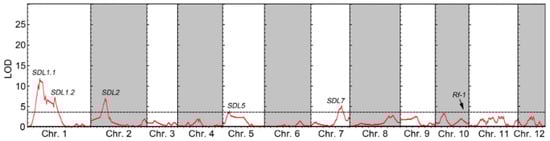 SDLs detected in the DH population are shown. The x-axis represents the physical position along each chromosome, while the y-axis represents the logarithm of odds (LOD). A horizontal dotted line indicates the LOD declaration threshold (3.5).