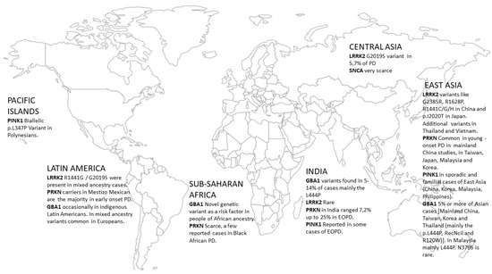 The accumulated data reviewed in our current report support the idea that the landscape of monogenic PD forms is heterogeneous among different populations. This applies especially to relatively common pathogenic variants in European ancestry populations (including the p.G2019S in LRRK2 and the p.N370S in the GBA1 gene). SNCA mutations were almost absent and observed rarely in Central and East Asian cases. East Asian patients often harbored different LRRK2 variants than European ancestry populations, with the p.G2019S mutation being especially rare. Parkin (PRKN) variants exhibited global distribution and were commonly encountered in EOPD in East Asians, in Indians and in early-onset PD of Mexican ethnicity. Other recessive genes like PINK1 and DJ-1 were occasionally reported in East and Southeast Asian, Indian and Pacific Islands populations. GBA1 variants were also widely distributed as a predisposing factor for PD and were found in East Asian and in Indian populations, whereas different GBA1 variants have been occasionally reported in Latin Americans. In Black African populations, a recently described novel GBA1 variant with a different proposed mechanism of action might play a crucial role in PD genetics [106].
