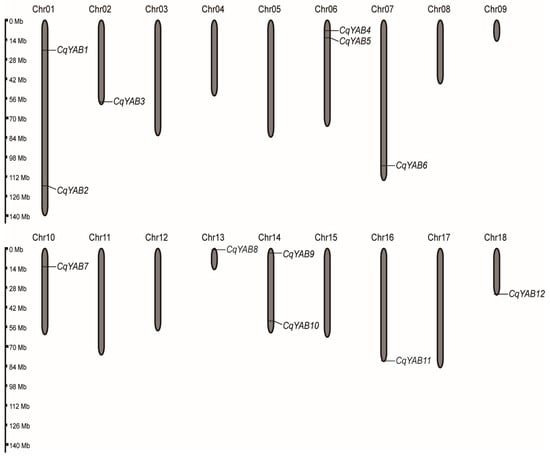 Chromosomal distribution of CqYAB genes. Chromosome numbers are shown at the top of each chromosome. The scale bar represents chromosome size.