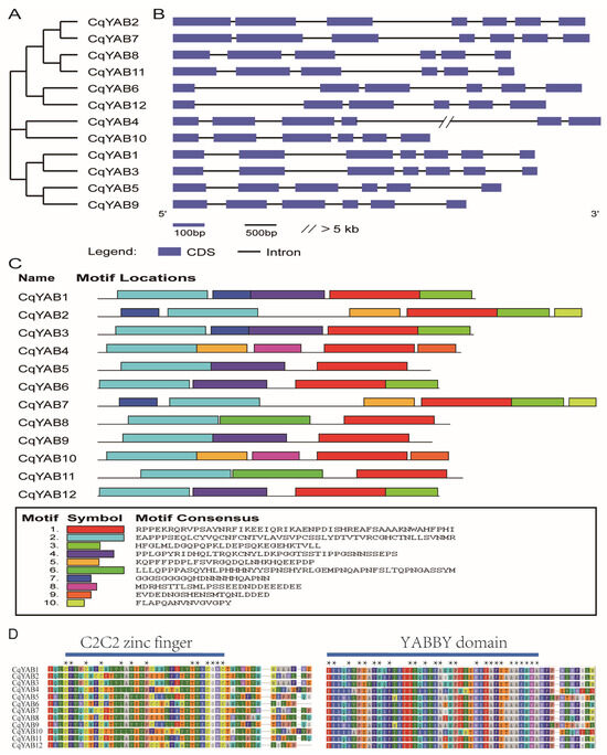 Phylogenetic relationships, gene structures, protein motifs, and domains of CqYABs. (A) Phylogenetic tree constructed through the neighbor-joining method. (B) Gene structures of CqYAB genes. Blue boxes indicate exons, and black lines indicate introns. The scale bar represents the length of exon or intron. The double slash depicts an intron length longer than 5 kb. (C) Motif composition of CqYAB proteins. Ten motifs were organized, each with a different color. (D) Conserved N-terminal C2C2 zinc finger and C-terminal YABBY domains of CqYAB proteins. Stars indicate the conserved amino acids in the domains.