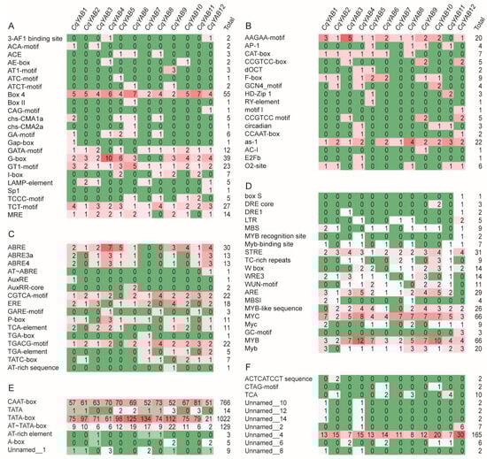 Cis-regulatory elements in the 3 kb promoter regions of CqYAB genes. The identified cis-elements were classified into six types. (A) Light-response elements. (B) Elements related to plant growth and development. (C) Phytohormone-response elements. (D) Stress-response elements. (E) Promoter-related elements. (F) Elements with unknown function. The names of cis-elements are listed on the left, and the numbers in different colors indicate the number of elements.