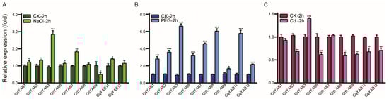 Expression responses of CqYAB genes under salt, drought, and Cd treatments. Two-week-old seedlings were treated with three stresses for 2 h and sampled for qRT-PCR. (A) Treatment with 200 mM NaCl. (B) Treatment with 15% PEG6000. (C) Treatment with 100 µM CdCl2 (Cd). The relative expression levels of genes were calculated using the 2−∆∆CT method. The expression level of the control (CK) was arbitrarily set to 1. Error bars indicate standard deviations of the mean value from three biological replicates and three technical replicates. Asterisks indicate significant differences in the expression between control and stress samples (* p < 0.05; ** p < 0.01; and *** p < 0.001).