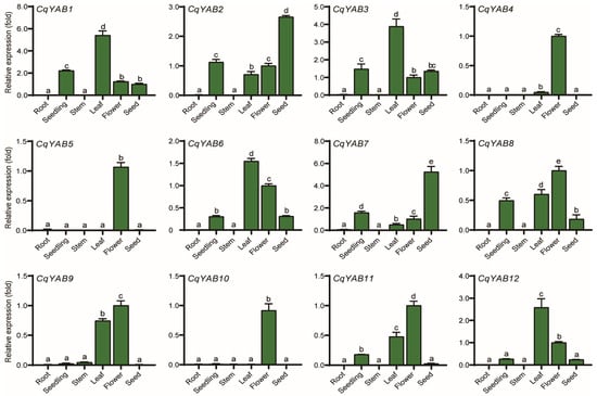 Expression patterns of CqYAB genes under normal growth conditions. The expression levels of the 12 CqYAB genes were determined in different tissues at different developmental stages through qRT-PCR, and a fold change in the expression level was shown for each CqYAB. The expression level in flowers was arbitrarily set to 1. CqACTIN2 was used as an internal control. Different letters indicate significant differences in expression levels.