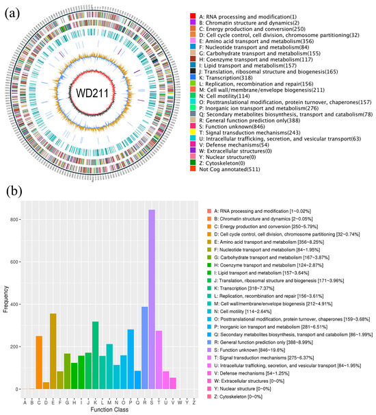 General features of the genome of strain WD211. (a) Circular chromosome map of strain WD211. (b) COG analysis of WD211.