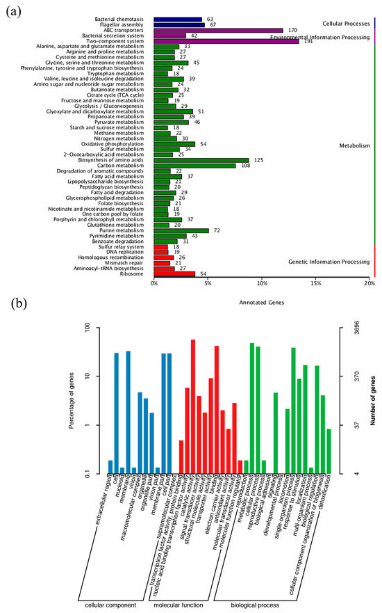 The G + C content was 62.75%, consisting of 4734 coding genes, 12 rRNA genes, and 67 tRNA genes. The genome of strain WD211 contained one pseudogene, two CRISPR, and 14 genomic islands (Table 2). A total of 4317 genes that were annotated according to the COG analysis were divided into 25 functional groups (Figure 2b); 2008 genes that were annotated according to the KEGG analysis were divided into five categories (Figure 3a) and 50 functional groups; and 3696 genes that were annotated according to GO were divided into three categories and 38 functional groups (Figure 3b).
