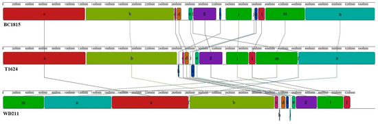 Currently, only two complete genomes of P. chengduensis have been made public, and only one of them has been briefly described [15]. We compared the genomes of two strains with that of a third strain, WD211, as illustrated in Figure 4. A total of 14 local collinear blocks (LCBs) were observed (minimum weight (MW) = 6770) in all three strains. The genomic structures of the three strains were found to be significantly different. The genome of strain WD211 underwent gene rearrangements in fragments f, h, j, and k in contrast with the genome of BC1815. Similarly, the genome of WD211 underwent gene rearrangements in fragments c, f, j, and k in contrast with the genome of T1624. Furthermore, gene fragments h and i in the WD211 genome underwent gene inversions. These structural changes in the genome provide the WD211 strain with an advantage for acquiring new traits.