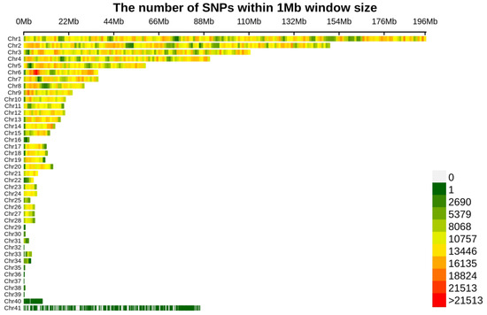 The phenotype data of age at first egg (AFE), weight at first egg (WFE), egg weight (EW), egg number at 40 weeks (EN40), egg number at 43 weeks (EN43), and maximum consecutive egg laying days (MCD) in the Shuanglian chicken population are shown in Table 1. Except for EW, the coefficient of variation (CV) of all traits is above 10%, with MCD having the highest CV (54.3%). Through whole genome sequencing and quality control, a total of 11,006,178 high-quality SNPs were obtained. The SNP density plot is presented in Figure 1. Principal component analysis (PCA) was carried out. And, the scatter plot of the first two principal components is displayed in Figure S1.