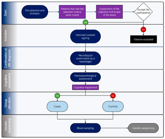 A group of MS patients from the Mexican Foundation for Multiple Sclerosis, A.C. who met the selection criteria were invited to participate. Those who agreed and signed an informed consent form were physically and neurological examined by an expert neurologist to confirm diagnosis. Once confirmed, a set of neuropsychological tests was applied to explore the presence or absence of CI. A non-randomized group allocation process was performed to generate both cases (CI detected) and control (no CI detected) groups. Finally, a blood sample was taken from all patients to perform genotypification (Figure 1).
