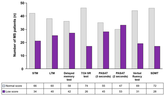 Cognitive performance of MS patients measured using Rao’s brief repeatable battery of neuropsychological tests. Light-gray bars represent normal scores and purple bars represent low scores. STM: short-term storage memory; LTM: recovering long-term memory; 7/24 SR test: 7/24 spatial recall test; PASAT: paced auditory serial addition test; SDMT: symbol digit modalities test.