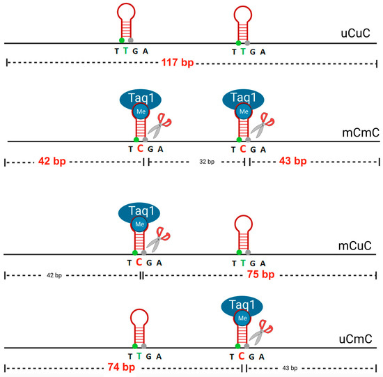 Digestion: In each model, enzyme Taq1 specifically identified methylated cytosine. The different methylation patterns of the Alu element resulted in differently sized digested products of 117 bp, 74/75 bp and 42/43 bp, resulting in five bands with distinct sizes of 117, 75, 74, 43 and 42 bp (in red). Scissors represent positions where enzyme Taq1 specifically identified methylated cytosine. The red shapes represent the first position of methylated or unmethylated cytosine.