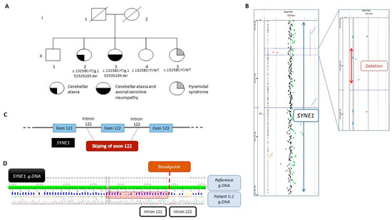(A) Pedigree of the family and segregation analysis of the SYNE1 variant NM_182961.4:c.13258C>T and the deletion NC_000006.11:g.152538134_152535265del. The filled bottom left quarter represents cerebellar ataxia symptom, the filled bottom right quarter represents axonal sensitive neuropathy, and the striped top quarter represents pyramidal syndrome. (B) View from Cytogenomic software (v.4.0.3.12) of SYNE1 with a focus on the two deleted oligonucleotides (red dots). (C) Schematic view of the deletion encompassing the exon 122 and part of intron 121 and intron 122. (D) Representative Sanger sequencing electrophoregrams illustrating the breakpoint between intron 121 and intron 122. The 23 bp homology sequence is shown in the red square.