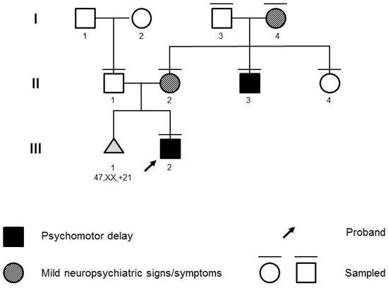The propositus (Figure 1; III:1) was a 28-month-old male infant referred for psychomotor delay. He was born at full term of an uneventful pregnancy. Standard fetal karyotype, performed at amniocentesis for a previous miscarriage due to trisomy 21, was normal. Upon clinical examination, mild motor delay and marked speech delay were noted. He started standing and taking steps, with support, at 18 months of age. At 24 months, he started walking on flat surfaces for small distances without support. He started pronouncing the first words by 24 months of age. Upon initial examination, a vocabulary of 5–10 words was reported. He was able to understand short, simple requests and sentences. He presented strabismus. The proband did not present notable facial dysmorphisms or malformations. Abdominal ultrasound and echocardiography scans were normal. Electroencephalograms were also normal. At familial history assessment, the father (Figure 1; II:1) reported a diagnosis of ichthyosis vulgaris. The mother (Figure 1; II:2) reported a brother (Figure 1; II:3) affected by mild intellectual disability, behavior anomalies, fine motor and speech impairment, and a healthy sister (Figure 1; II:4). The mother herself showed signs of anxiety. Upon further investigation, she provided previous personal clinical records reporting Attention-Deficit and Hyperactivity Disorder (ADHD) and learning disability, requiring support teaching.