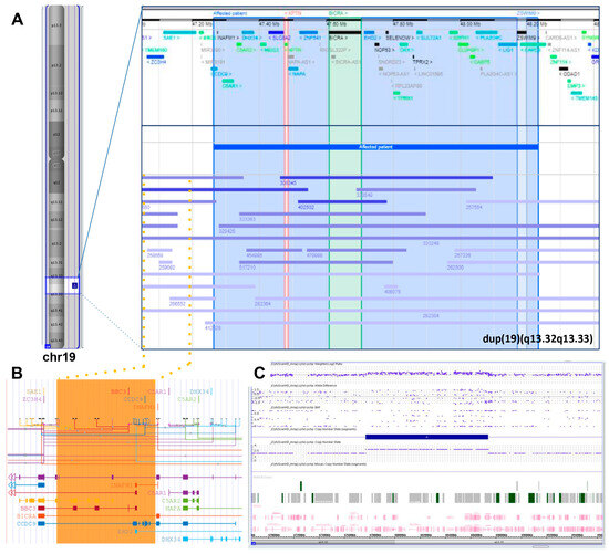 (A) The extra copy of the 19q13.32q13.33 region identified by SNP-array in the present case, detailed in (C), compared with the other overlapping gains (<3 Mb in size) reported on the DECIPHER database (https://www.deciphergenomics.org/; hg38 release. Last accessed 30 August 2023). Vertical lines highlight the potential candidate genes (KPTN, BICRA, and ZSWIM9) and dotted lines and orange area indicate a fourth candidate area shared by several cases and including a regulatory region of the BICRA gene, as reported on the UCSC browser (https://genome.ucsc.edu/ (Last accessed on 30 August 2023); hg38 release) (B). The source files for the image are provided in Supplementary Materials Figure S1.