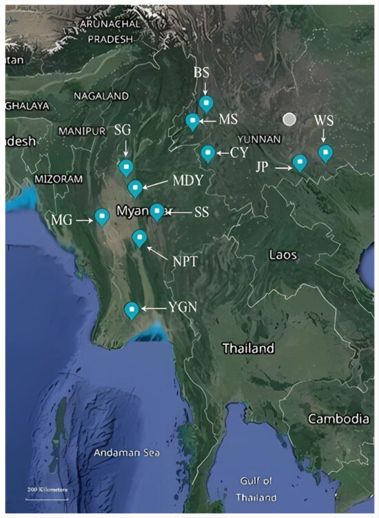 Sample collection sites of S. furcifera populations in Myanmar and Yunnan Province, China. The map was generated using Google Maps application (https://www.google.com/maps/, accessed on 1 November 2020).