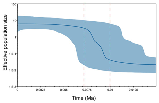 To estimate the population expansion time, we utilized the Bayesian skyline plot based on the mtCOI gene in BEAST version 1.6.1 [42]. In the analysis, we used a substitution rate of 1.77% per million years [43] and the GTR + G model. The Markov Chain length was set to 300 million generations, and an uncorrelated lognormal relaxed clock model was employed, allowing rate variation among branches. During the analysis, we sampled every 1000 steps. We employed the piecewise linear skyline model with Bayesian skyline coalescent tree priors, and default values were used for other parameters. To ensure the accuracy of the results, a 10% burn-in was applied, and the results of the Bayesian skyline plot were thoroughly examined and analyzed using Tracer version 1.7 [42].