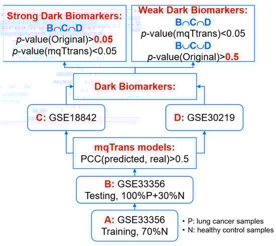 We screen two groups of dark biomarkers, as shown in Figure 1. We define a transcriptomic feature as a dark biomarker between the disease group and the control group if its original values are not differentially expressed (p-value(Original) > 0.05) and its mqTrans values are differentially expressed (p-value(mqTrans) < 0.05). A strong dark biomarker meets the dark biomarker requirement in all the investigated datasets, while a weak dark biomarker only meets the requirement in one dataset and has a p-value(Original) > 0.5 in the same dataset.