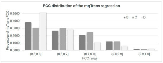 We screened for mqTrans regression models trained in a dataset A with PCC > 0.5 between the predicted and real expression levels in a dataset B, as shown in Figure 2. A threshold PCC > 0.5 has been previously used to determine the co-expression patterns of two biological molecules []. There were 5820 mqTrans regression models achieving a PCC > 0.5 in dataset B. A total of 2396 and 1146 of these models kept achieving a PCC > 0.5 in the two datasets C and D, respectively. There were 116 mqTrans models achieving a PCC > 0.9 on the validating samples of the same dataset, GSE33356. Even on the two independent testing datasets C (GSE18842) and D (GSE30219), 49 and 24 mqTrans regression models achieved a PCC > 0.9 between the predicted and real expression levels.
